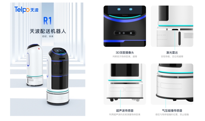 正如天波智能商用服务机器人R1,内置激光雷达、3D深度摄像头、超声波传感器以及气压碰撞传感器等,可支持自主巡航和自动避障功能,实现自主导航巡逻配送、医院餐厅楼宇配送。除此之外,天波智能商用服务机器人R1搭载双目摄像头和AI语音模块,精准人脸识别和AI 智能语音交互,支持长时间续航,自带双层大容量储物仓,支持30kg大容量装载,可作为配送机器人和送餐机器人使用。