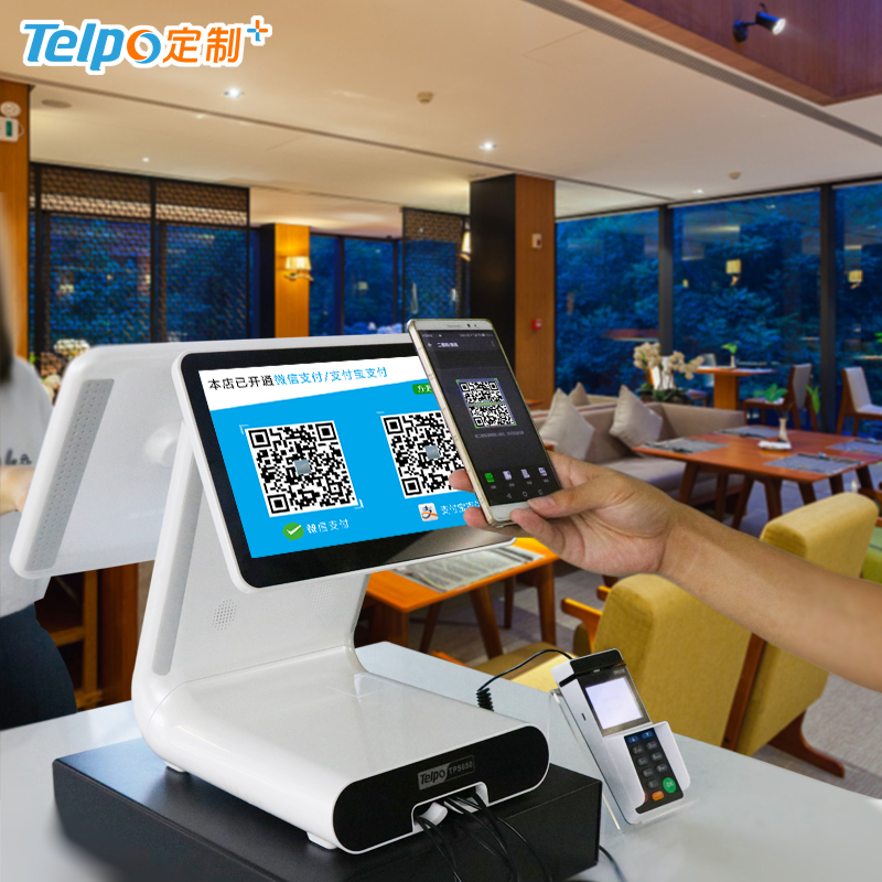 天波智能硬件针对新零售的特点,定制开发了智能收银5.0旗舰产品TPS650智能收银机,采用安卓5.1操作系统,CPU采用四核高速处理器,工业级主板,不仅速度快,而且性能稳定。在屏幕选择上采用主流大屏幕15.6英寸,高清分辨率1920*1080,客屏11.6英寸,同样分辨率1920*1080,双屏全部采用触控屏,支持双屏异显。